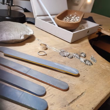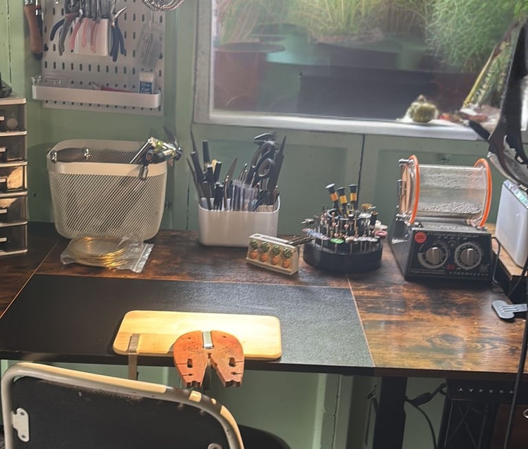 Over the years, we’ve built a versatile collection of tools to support every stage of our jewellery-making process. Our workspace features an adjustable desk for designing and precise sawing, along with essential equipment such as an ultrasonic cleaner, pickle pot, and a range of rotary and hand tools. Recently, we’ve added radial discs a new rotary accessory for fine sanding helping us achieve an even higher level of precision and finish in each piece we create.